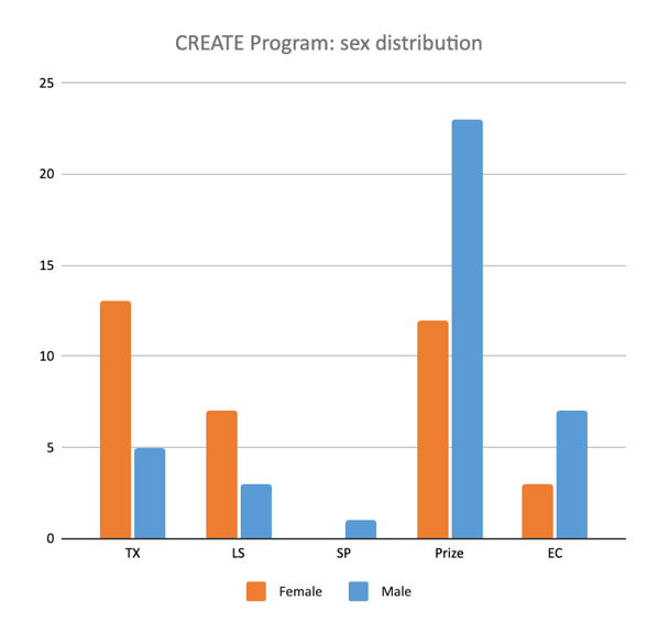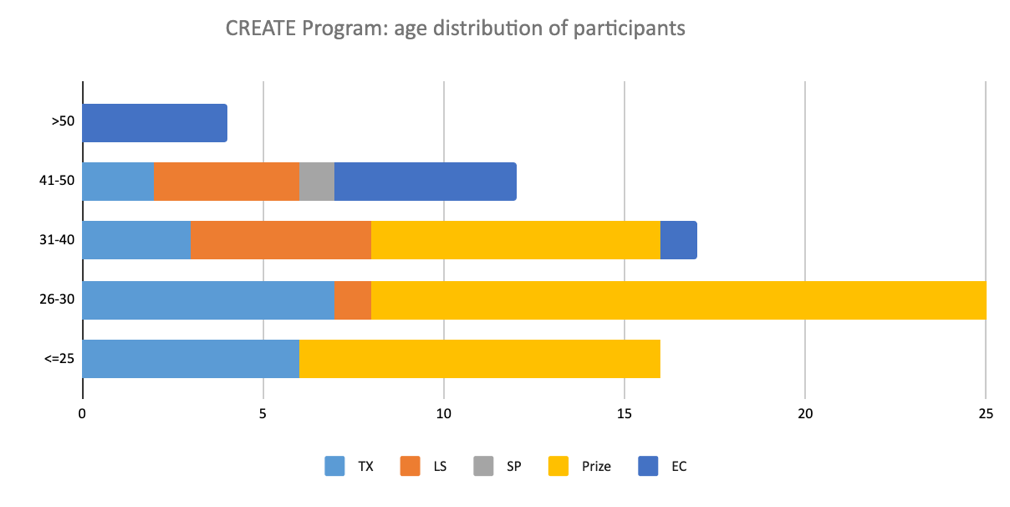 CREATE Prize (CP): 35 essays, with 4 winners and 15 essays published in a series of four books. Apart from the wide range of topics covered, one of the interesting things about the prize is the number of young men it attracted; the prizewinners were all men, and two thirds of the submissions and published essays were by them too. Two other notable factors are that the prize tended to attract a relatively young cohort, like TX (see below), when compared to the other CREATE activities, and had the widest representation of countries.